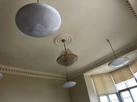 Infrared heaters, at significantly less wattage than the electric boilers, have been installed. The large lounge area, with its high ceilings typical of a period property, has four Herschel white Pulsar heaters installed around the chandelier showpiece.
