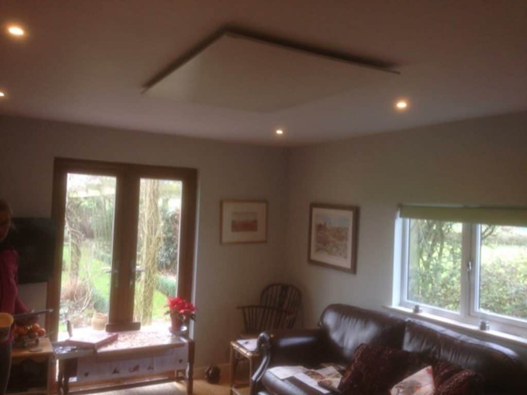 We had planned from the outset to install the panels on the ceiling as all the information we had read suggested that this would provide by far the best distribution of heat throughout the room. As the property was a conversion and had new ceilings, we could design the arrangement of the downlights and the heating panels to complement each other and the electrician laid out the wire to the panels and the isolation switches as part of the first fix. After plasterboarding and skimming we were ready to paint. We took one of the Select XL panels along to our local building supplies and they scanned it and then mixed a batch of paint to match the tone – very simple and extremely effective. After painting we installed the panels, a very simple job given the superbly designed mounting bracket and template that is supplied. We screwed the bracket to the joists where possible or simply added a short section of timber behind the plasterboard if the fixing location did not meet an existing joist. A hole then needed drilling to feed the panels’ cable through to meet the wiring in the loft (or between joists if installing in the ground floor). After that it was a simple matter of locating the lugs in the back of the panel into the corresponding slots on the bracket and the installation of the panels was done – 30 minutes per panel!